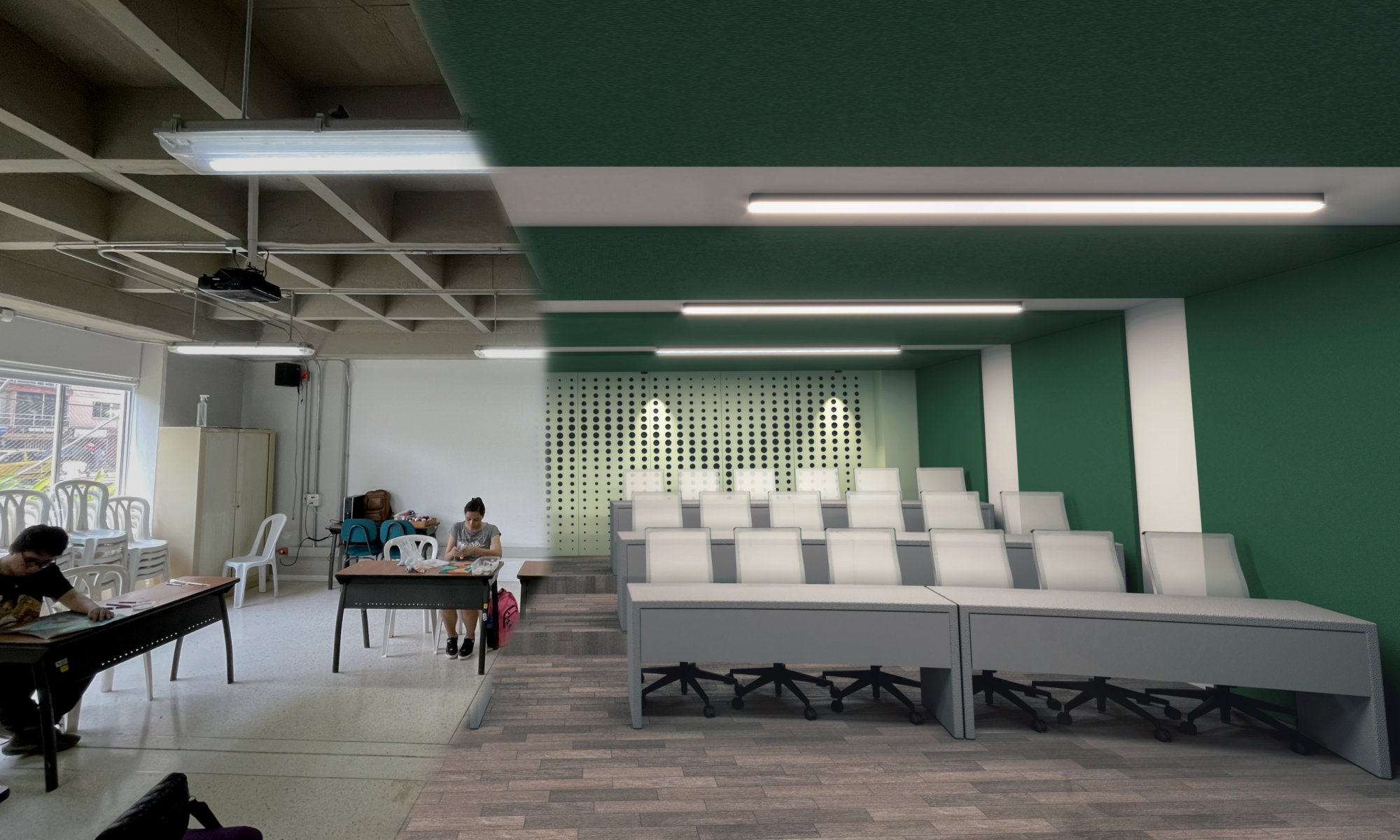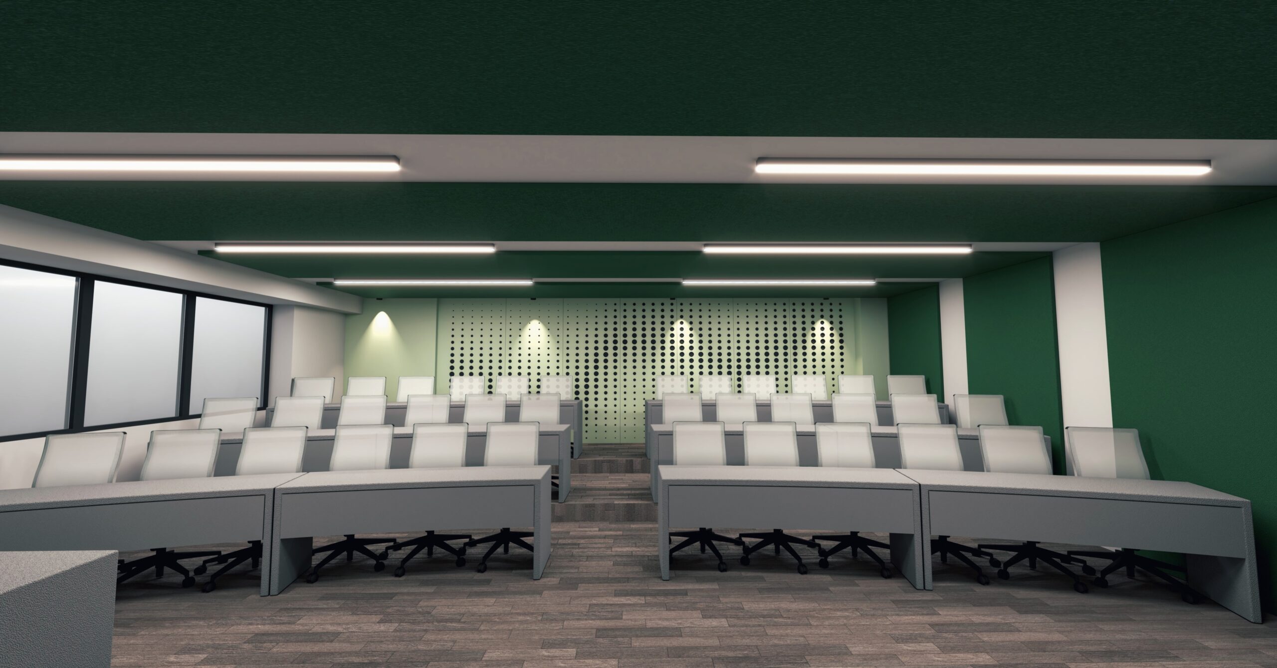 El proyecto consiste en la renovación interior de una de las aulas existentes del bloque 1 en la Universidad Cooperativa sede Cali, para convertirla en un moderno salón de posgrados equipado con servicios tecnológicos avanzados. El diseño se enfoca en optimizar la distribución del espacio, incorporando mobiliario personalizado y un sistema de iluminación diseñado específicamente para las actividades educativas. El objetivo es crear un ambiente propicio para el aprendizaje y el uso eficiente de la tecnología en la educación, brindando a los estudiantes de posgrado un entorno inspirador y funcional para su formación académica.